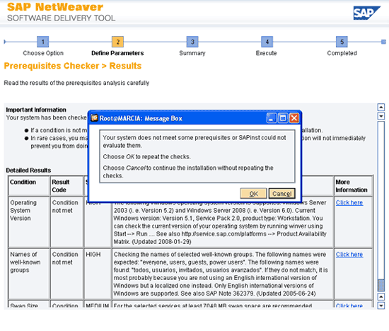 En la siguiente pantalla, el programa de instalación evaluará si la configuración de nuestra computadora cumple con los prerrequisitos para la instalación. Seguramente habrá alguno o más puntos que no cumplamos. Igual así, seguiremos adelante con la instalación presionando el botón Cancel.