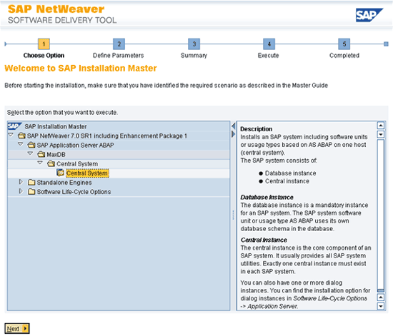 Veremos la siguiente pantalla donde seleccionaremos la opción SAP Netweaver 7.0 SR1 including Enhacement Package 1/SAP Application Server ABAP/MaxDB/Central System/Central System y presionamos