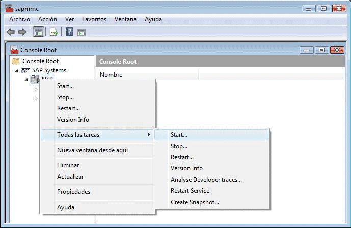 Para poder trabajar con el sistema SAP, cada vez que prendamos nuestra PC, debemos levantar el servidor de aplicaciones. Para ello, hacemos doble click en el ícono SAP Management Console. Una vez abierta la aplicación, abrimos el menú NSP/Todas las tareas y presionamos Start.
